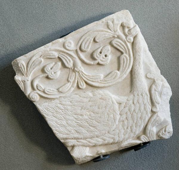 Frammento mediano di lastra per ambone (oggi ricomposto con MR5840), nel quale sono raffigurati due girali interi della parte superiore, parte del collo e di una coscia del pavone e quasi tutta la zona centrale del corpo di quest'ultimo. La facciata retrostante è liscia
