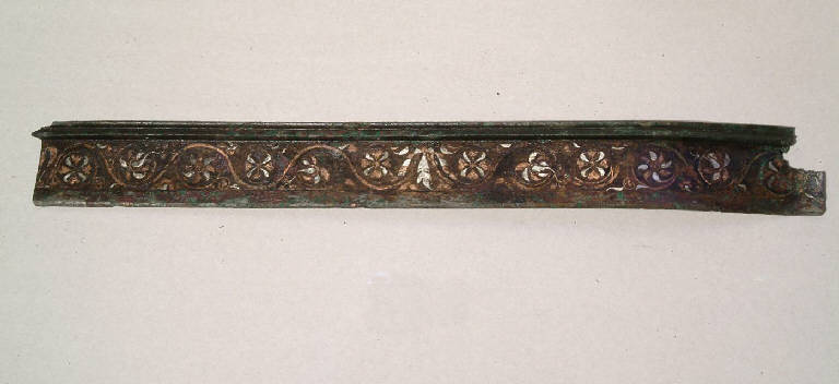 Cornice decorata a girali e rosette e modanatura liscia aggettante, con estremità piegata e lacunosa