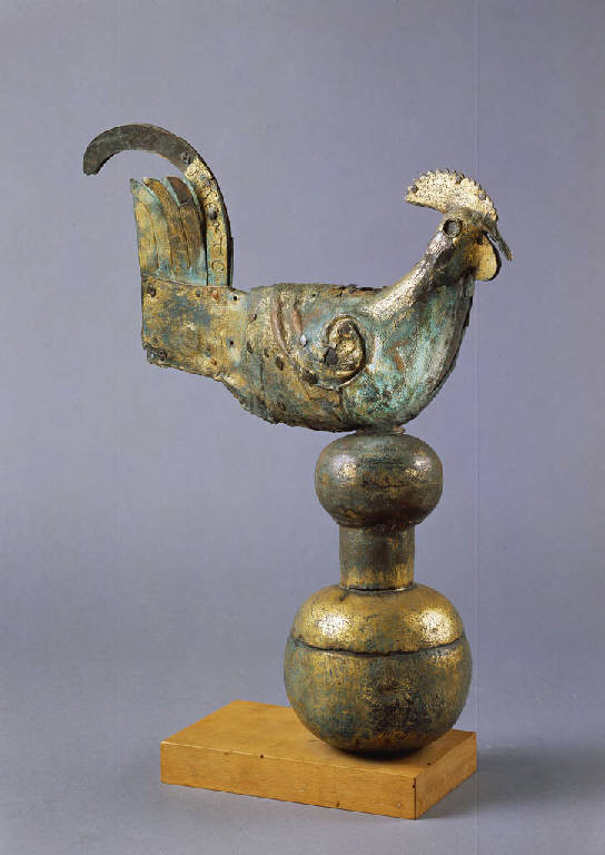 Gallo stilizzato posto sopra una base a due sfere sovrapposte, con collo di congiunzione, costituito di alcune lamine di rame dorate battute e incurvate, unite in chiodi a ribattere. Gli occhi dovevano essere in pasta vitrea. Sulla coda reca incisa un'iscrizione in elegante grafia di apparato, con marcati ispessimenti apicali. L'uso della capitale è omogeneo, ma per la E si ricorre all'onciale, e sono presenti lettere minuscole.