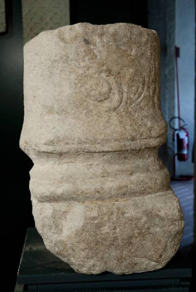 Frammento di imoscapo con base quadrangolare articolata in doppio toro e una scozia. Nel fusto si distingue una ripartizione in fasce separate da una cordonatura a torciglione. Gli unici elementi decorativi ancora parzialmente visibili sono pertinenti a una sola fascia. Essi sono posti alla base del fusto e consistono in foglie rotanti disposte attorno a un grappolo d'uva. E' perforata internamente per tutta la lunghezza da un'apertura circolare avente il diametro di cm 4.