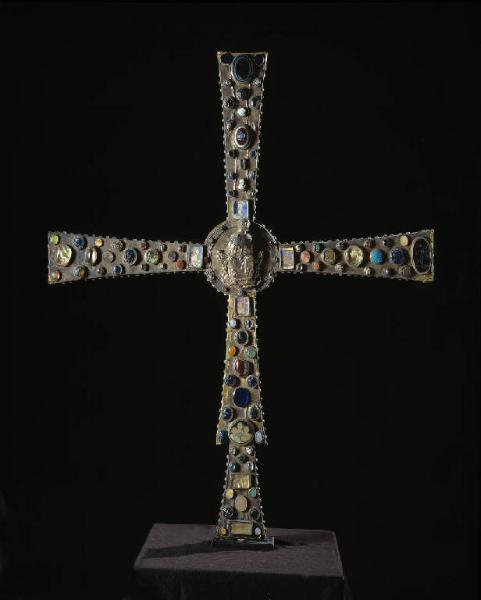 Croce liturgica formata da una struttura in legno rivestita di lamine metalliche ribattute sui fianchi e fissate con chiodi. Sulle lamine sono incastonati 212 elementi decorativi: pietre dure, cammei, pietre incise e gemme vitree. Sul recto, nel braccio inferiore è collocato un medaglione aureografico, eseguito nel IV secolo d.C., nel quale sono incisi tre ritratti su una foglia d'oro inserita fra due strati di vetro. Il medaglione porta in caratteri greci la firma del suo autore. Delle gemme che coprono con uno schema decorativo "a tappeto" le facce della croce molte sono di epoca romana, altre di età tardolongobarda e carolingia (i cammei in pasta vitrea), altre ancora integrate in tempi successivi. All'incrocio dei bracci si trova su ogni faccia un grande tondo: quello sul recto fa da sfondo alla figura di Cristo in trono, databile al X secolo; l'altro ad un Crocifisso, aggiunto al manufatto nel secolo XVI. Il recto è decorato pure da quattro miniature, dei secoli IX - X (gli evangelisti Marco e Luca) e del XV (Cristo e la Vergine)