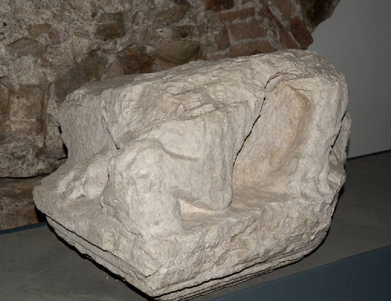 Il blocco è pertinente allo spigolo inferiore di un monumento funerario figurato. Nella parte sottostante resta una porzione delle modanature, lisce, articolate in listello, gola, listello, cavetto, listello.