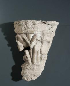 Capitello con piccolo elemento a giglio tra due foglie costolate. La base presenta elementi di attacco con una semicolonna