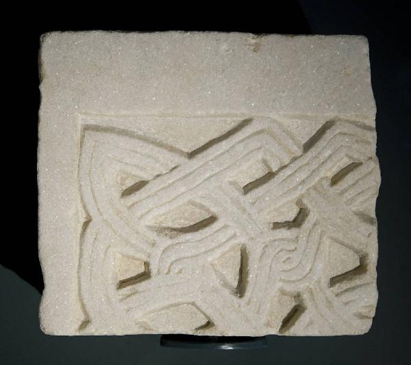 Frammento angolare di lastra bordata lateralmente da una fascia liscia, mentre il campo centrale è occupato da un complesso motivo ad intreccio di nastro trivimineo con cerchi annodati a motivi a otto.