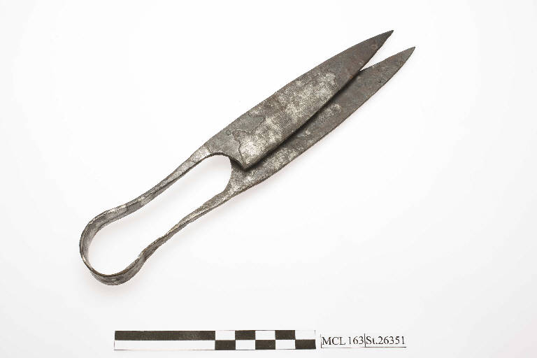 Cesoie in ferro con molla ad anello e lame larghe. Lame a dorso lievemente arcuato.