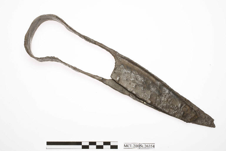 Cesoie in ferro con molla ad anello e lame larghe a dorso rilevato.