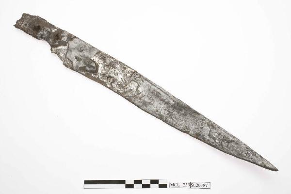Coltello in ferro a dorso lievemente arcuato e taglio sinuoso.