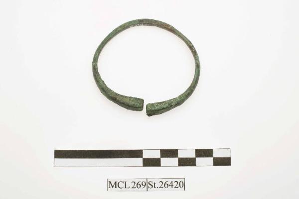 Armilla in bronzo a testa di serpente, di cui resta solo qualche traccia, con estremità aperte ed ingrossate; sezione circolare.