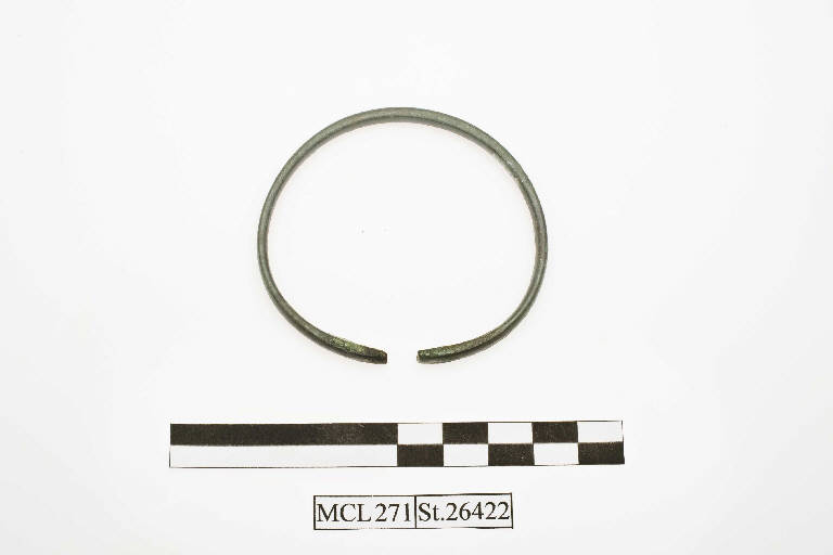 Armilla in bronzo con estremità leggermente ingrossate, una delle quali presenta una sagomatura che richiama il tipo a testa di serpente; sezione quadrangolare.