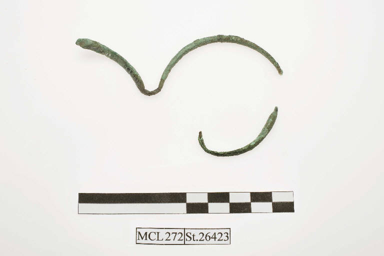 Armilla in bronzo ad estremità ingrossate, sezione semicircolare. Corrosa, contorta e spezzata in due parti.