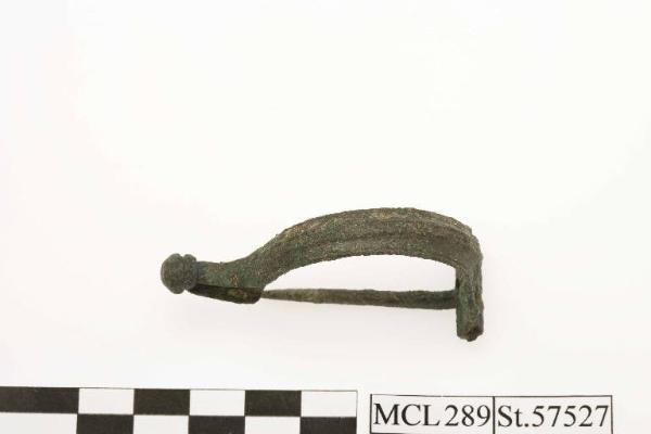 Fibula in bronzo tipo Aucissa, arco semicircolare nastriforme, si restringe verso la staffa che termina con globetto scanalato. L'arco presenta i margini e la costolatura mediana decorati da trattini incisi. Perno in ferro.