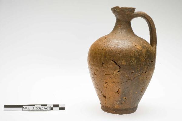 Olpe con orlo a becco, colla svasato, corpo a ventre rialzato su piede a disco appena distinto. Ansa nastriforme con depressione centrale, impostata sul diametro massimo si salda al collo.