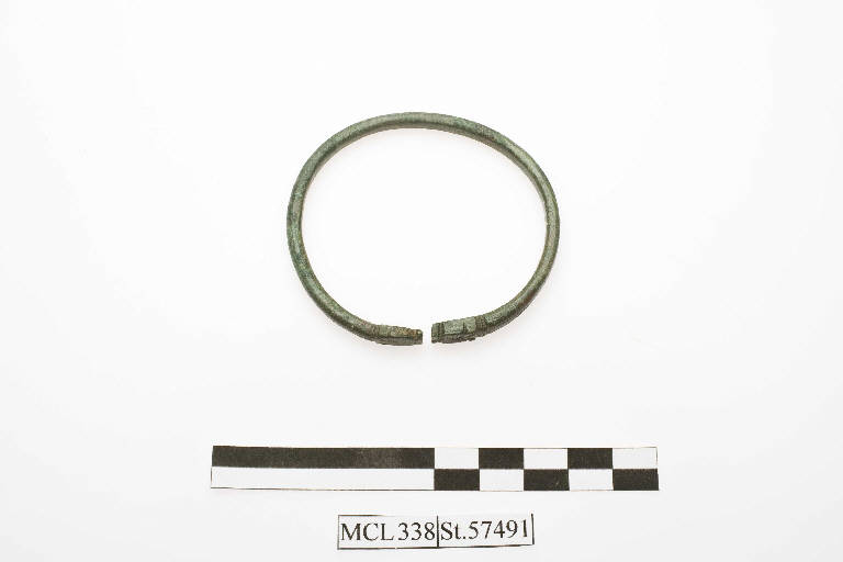 Armilla in bronzo a testa di serpente, sezione quadrangolare ad angoli arrotondati. Le estremità a testa di serpente sono ben modellate e precedute da una decorazione costituita da due fasce convergenti di puntini incisi.