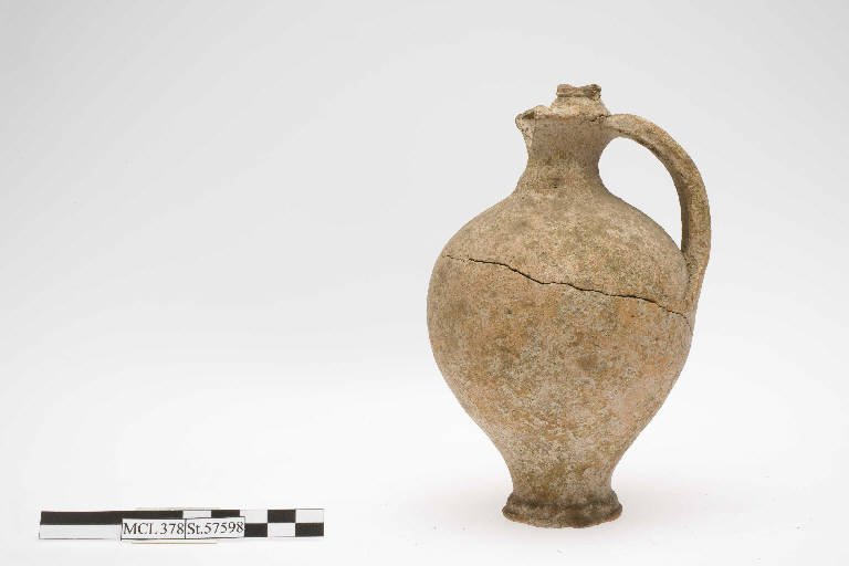 Olpe ovoide invetriata; orlo verticale rientrante che forma una carenatura con il breve collo svasato, piede a disco con scanalature. Ansa nastriforme saldata alla carenatura. Invetriatura scomparsa.