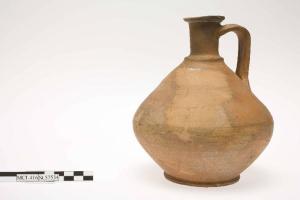 Olpe con orlo estroflesso superiormente piatto, collo cilindrico appena svasato, distinto dalla spalla mediante una costolatura, corpo biconico e piede a disco su base ad anello. Ansa nastriforme a quattro costolature impostata sulla spalla e saldata al collo.