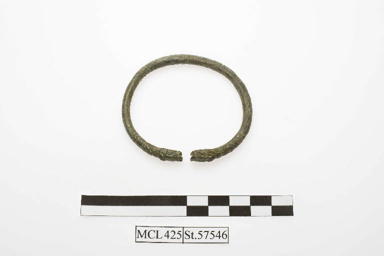 Armilla in bronzo a testa di serpente con estremità ben modellate, precedute da una decorazione costituita da fasce di linee parallele; sezione circolare.