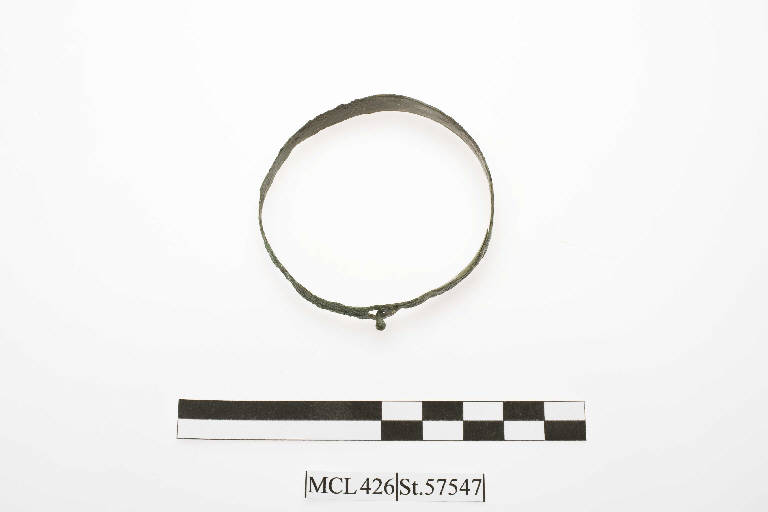 Armilla in bronzo con allacciatura a bottone. Nastro piatto decorato da una doppia fila di circolini incisi separati da una linea ondulata, il tutto racchiuso entro due fasce di trattini paralleli; allacciatura con bottone terminale.