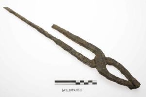 Tenaglie in ferro, un braccio è frammentato. Una delle ganasce termina con due alette tra le quali si inserisce l'estremità dell'altra; sezione quadrangolare che diventa circolare all'impugnatura.