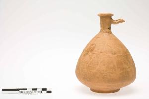 Olpe piriforme con orlo estroflesso a profilo triangolare nettamente distinto dal collo cilindrico con leggera strozzatura alla base, piede distinto a disco con solcatura presso il bordo. Ansa nastriforme a quattro costolature, saldata al collo.