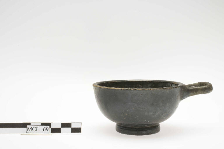 Coppa monoansata a vernice nera. Piede ad anello internamente convesso; corpo emisferico con orlo piatto lievemente introflesso. Ansa quasi nastriforme orizzontale con anello subtrapezoidale lievemente rialzato.