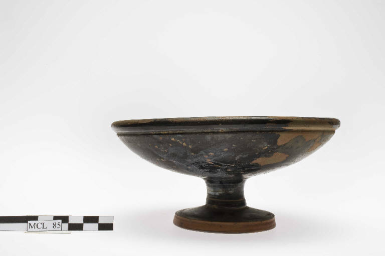 Coppa su stelo a vernice nera precampana. Piede a larga tesa, segnata da spigolo, sormontato da tozzo stelo a rocchetto che si svasa in un corpo emisferico ribassato, separato da una scanalatura da uno spesso orlo arrotondato.