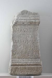 Ara a Mercurio. Ara con base troncopiramidale, collegata al corpo, anch'esso troncopiramidale, da tre listelli uguali e poco rientranti. Altri cinque listelli, di larghezza diversa ed aggettanti, collegano il corpo al coronamento, centralmente a timpano e forse in origine tricuspidato. Superficie lisciata in modo approssimativo.