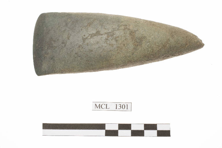 Ascia in pietra verde levigata di forma tendenzialmente trapezoidale.