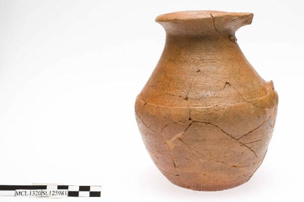 Brocca ansata biconica, orlo estroflesso triangolare, fondo piano; mutila dell'ansa.