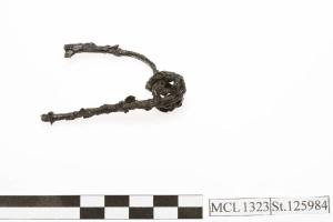 Frammento di fibula in ferro con arco a gomito e molla a doppio avvolgimento laterale.