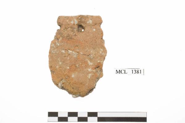 Frammento di orlo di olla a fori non passanti. Impasto grossolano.