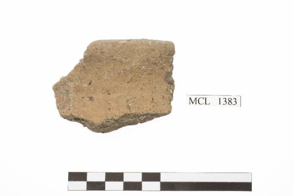 Frammento di orlo di olla arrotondato e estroflesso. Impasto grossolano.