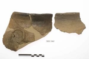 Due frammenti di grande vaso in impasto grossolano. Orlo arrotondato con leggerissimi ditate, corpo presumibilmente ovoide, decorato sulla spalla con un cordone plastico ad U rovesciata.