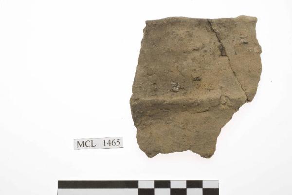 Frammento di orlo di olla ovoidale, orlo indistinto lievemente appiattito con leggere ditate e cordone plastico orizzontale a poca distanza dall'orlo. Impasto grossolano.