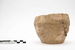 Vasetto troncoconico con orlo a scivolo interno e fondo lievemente concavo; decorato ad unghiate. Impasto grossolano.