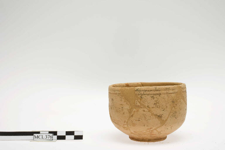 Coppetta a vernice rossa poco coprente interna ed esterna. Orlo verticale liscio e arrotondato, sottolineato da due solcature parallele, corpo cilindrico a pareti lievemente rientranti che si innestano sul fondo con carenatura arrotondata, piede ad anello percorso internamente da una solcatura circolare.