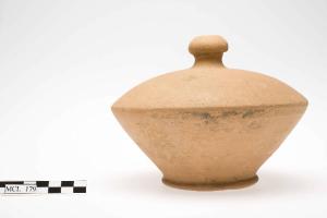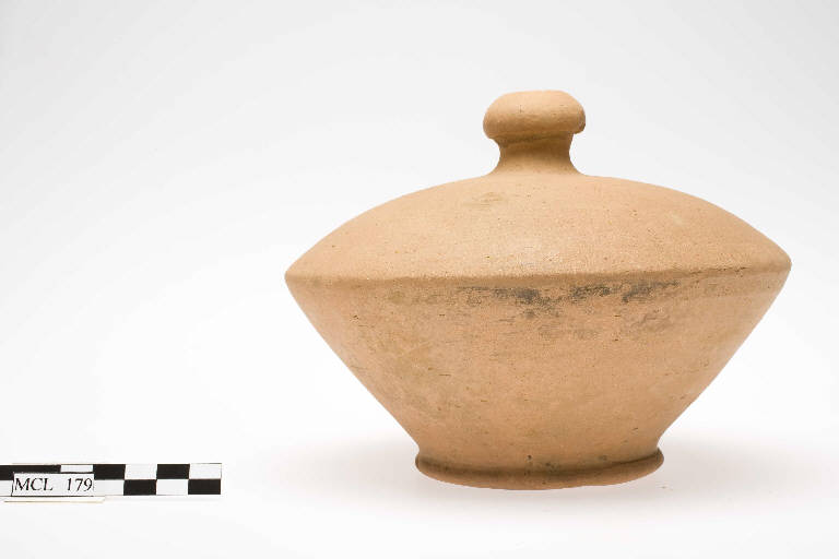 Vaso a trottola di forma bassa e schiacciata; imboccatura a tronco di cono, collo corto e stretto, spalla arrotondata, basso piede ad anello, fondo convesso.