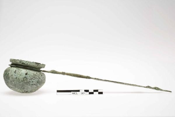 Mestolo in bronzo di tipo Pescate. Manico con l'estremità desinente a testa d'anatra e ripiegata ad anello. Anche l'estremità distale del manico è foggiata a testa d'uccello. La tazza ha forma globulare, con una stretta gola dove il filo di bronzo del manico passa e s'aggancia; orlo diritto.