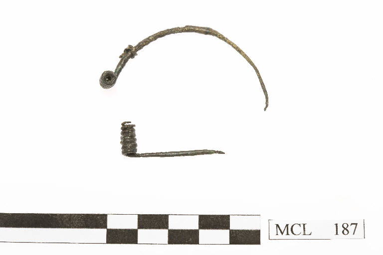 Arco e frammento di molla di fibula in bronzo tipo Misano, costituita da un filo di bronzo con il prolungamento della staffa che si aggancia all'arco tramite un collarino (conservato). Molla bilaterale con corda esterna.