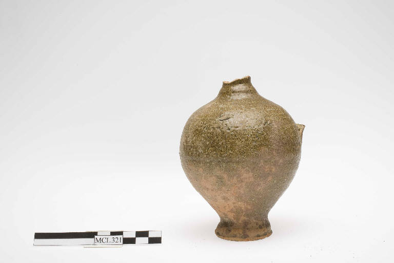 Olpe ovoide con invetriatura verde irregolare, piede a disco sottolineato da una solcatura. Mutila di collo e ansa.