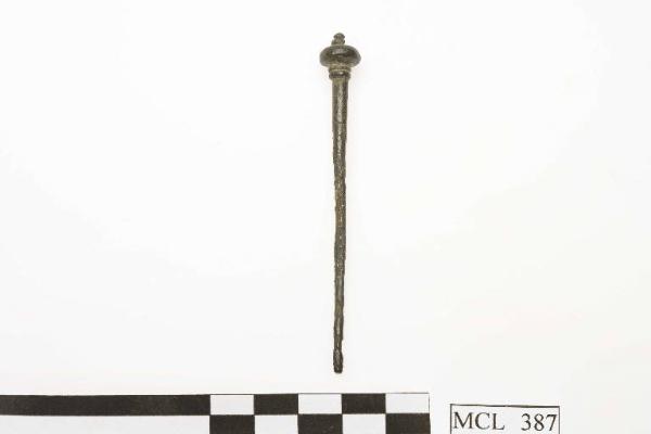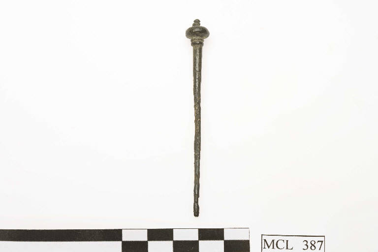 Ago crinale in bronzo, sezione circolare, alla sommità piccolo globo sormontato da due globetti più piccoli, al di sotto del globo due costolature sul fusto.