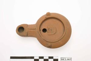 Lucerna del tipo Firmalampen; il serbatoio è troncoconico rovescio, la spalla inclinata con due borchiette contrapposte, il disco ribassato piano con foro di alimentazione circolare e decorazione con maschera, becco a canale chiuso.\nCon foro di aerazione.\nLucerna a canale chiuso; il serbatoio è troncoconico rovescio, la spalla inclinata con due borchiette contrapposte, il disco ribassato piano con foro di alimentazione centrale circolare e becco a canale aperto con foro di aerazione.
