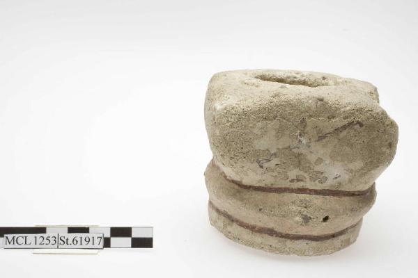 Vasetto reliquario di forma cubica con spigoli arrotondati; il profilo è sagomato nella metà inferiore da due larghe solcature. Piccola cavità emisferica fiancheggiata dai fori di fissaggio per la copertura. All'esterno tracce di imbiancatura, in rosso bande dipinte lungo le solcature e tracce di un cristogramma su un lato; sul fondo esterno è incisa una croce monogrammatica.