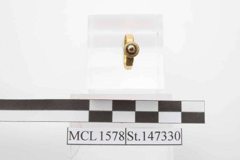 Anello in oro costituito da una fascetta decagonale decorata da un castone circolare con pasta vitrea rossa.