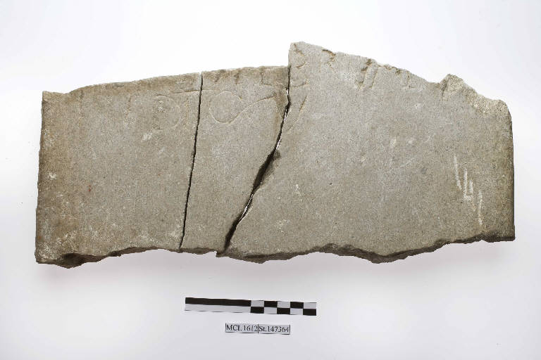Tre frammenti combacianti in pietra bruno-grigia di Aurisina; faccia posteriore lavorata grossolanamente e smussata sui bordi esterni
