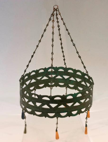 Ricostruzione della corona pensile in lamina bronzea con pendagli in vetro colorato, che si trovava nel 2° piano del 'Grande edificio' del sito archeologico di Barra, simbolo del potere esercitato dall¿occupante del palazzo.