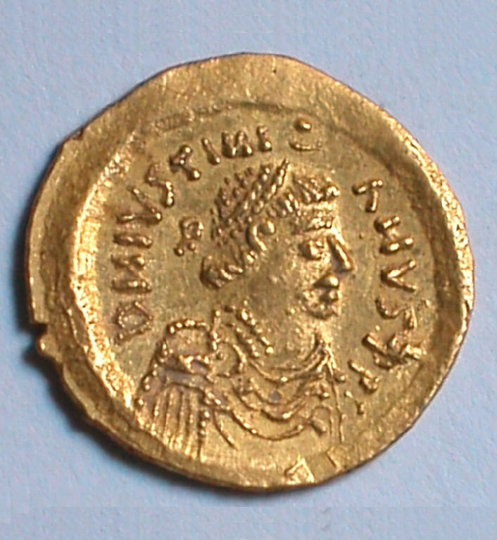 La moneta, che rompe gli schemi dell¿artigianato locale, rappresenta l¿odiato nemico Giustiniano (527-565 d.C.): è infatti un Tremisse aureo dell¿Imperatore d¿Oriente, probabilmente sottratto ai Bizantini nel corso di qualche saccheggio o scontro sanguinoso durante la guerra greco-gotica (535-553).