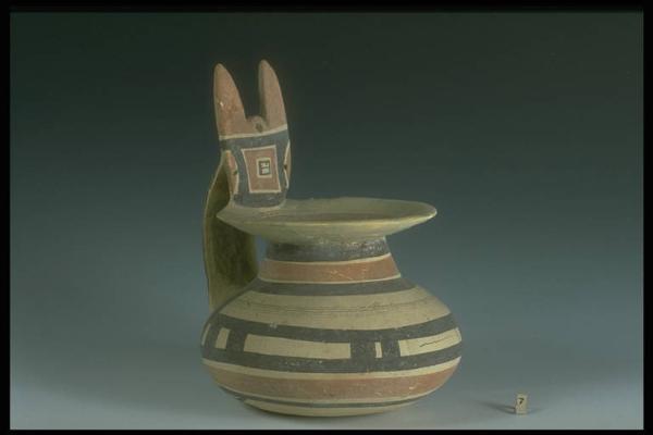 Labbro espanso impostato obliquamente, corpo apodo globulare compresso, ansa cornuta sormontante. Decorazione bicroma con motivi a fasce, linee a tremolo, traingoli e quadrati