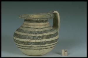 Labbro espanso a piattello, corpo apodo globulare compresso, ansa sormontante a nastro. Decorazione bicroma con motivi a fasce.