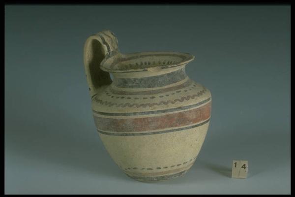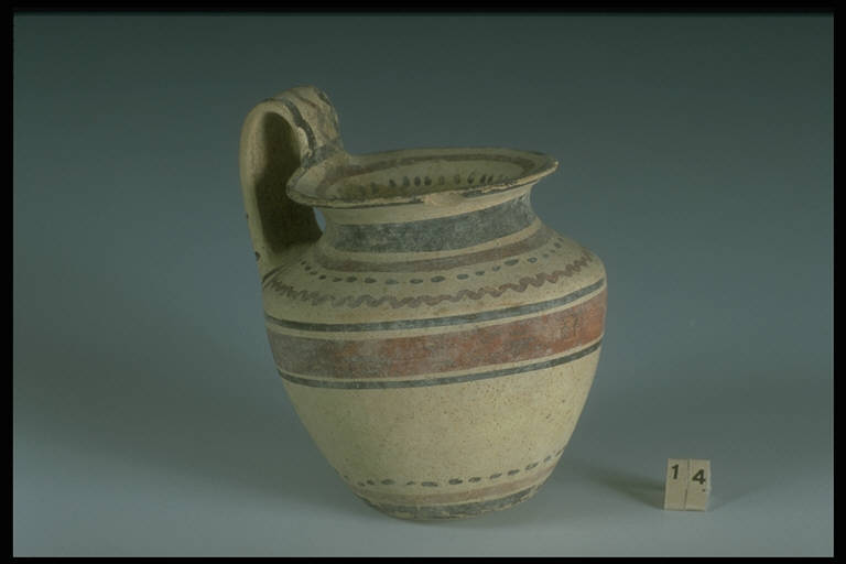 Labbro svasato, corpo apodo ovoidale con spalla obliqua, ansa a nastro sormontante. Decorazione bicroma con motivi a fasce, linee ondulate e file di punti.