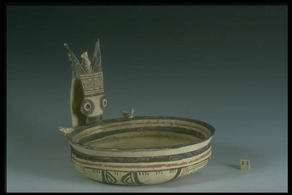 Breve labbro obliquo, vasca profonda a profilo convesso, alta ansa a nastro desinente con due corni tra i quali, al di sopra di due globi oculari, è collocata una figurina femminile fittile; ai lati dell'ansa due testine di animale. Decorazione bicroma con motivi a fasce, trapezi, losanghe, doppie protomi di uccello, scalette.